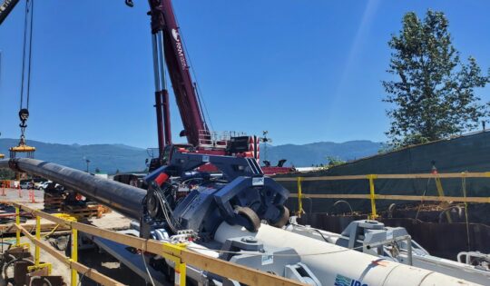 在Sumas河下安装管道,将采用“直接安装管道”的非开挖施工方法。设备安装和管道分段的临时工作区将位于Sumas河东侧(钻机侧)的私人财产上。Sumas河西侧需要有限的临时工作空间和通道来回收直管设备。一根套管将按预先确定的钻探路径插入地下,同时通过缓慢旋转微型隧道机表面的切割头来挖掘土壤/基岩。一旦安装完毕,新管道将穿过套管。然后将套管拉出,同时将可流动的灌浆插入套管之间的空隙中。钻探阶段完成后,该场地将恢复原来的用途。