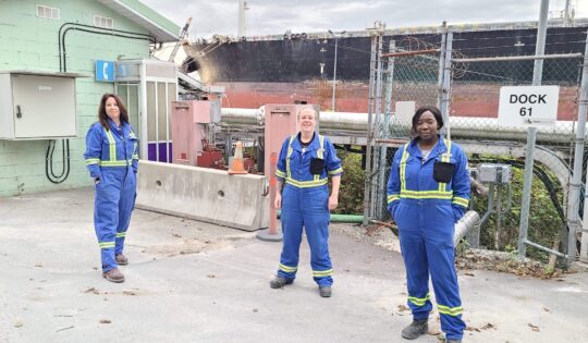 在卑斯省伯纳比市的伯拉德湾,了解一些让Trans Mountain的韦斯特里奇海运雷竞技app官网下载码头安全运行的人。